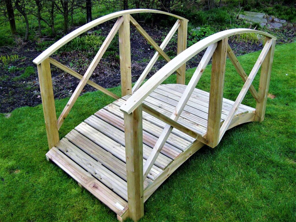 The Peking garden bridge is a stylish wooden bridge with low profile side poles and rails. It is available in brown and natural wood colours, and is also paintable.